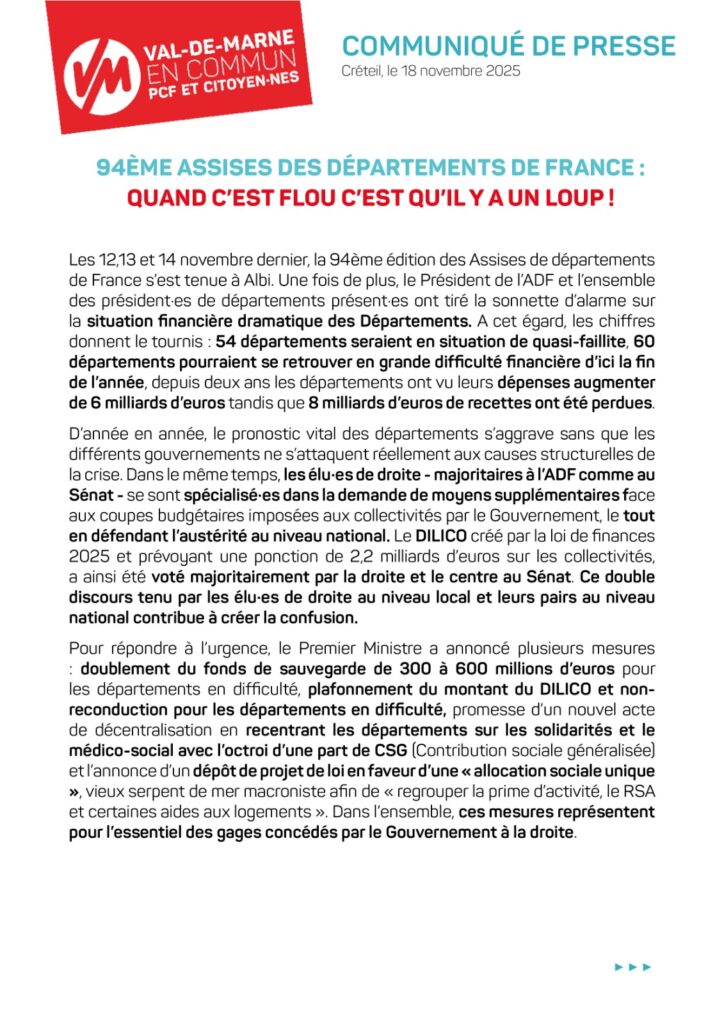 Les 12,13 et 14 novembre dernier, la 94ème édition des Assises de départements de France s’est tenue à Albi. Une fois de plus, le Président de l’ADF et l’ensemble des président·es de départements présent·es ont tiré la sonnette d’alarme sur la situation financière dramatique des Départements. A cet égard, les chiffres donnent le tournis : 54 départements seraient en situation de quasi-faillite, 60 départements pourraient se retrouver en grande difficulté financière d’ici la fin de l’année, depuis deux ans les départements ont vu leurs dépenses augmenter de 6 milliards d’euros tandis que 8 milliards d’euros de recettes ont été perdues.…